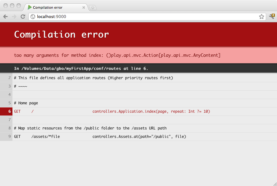 路由在 conf/routes 文件中定义,该文件已编译。这意味着您将在浏览器中直接看到路由错误