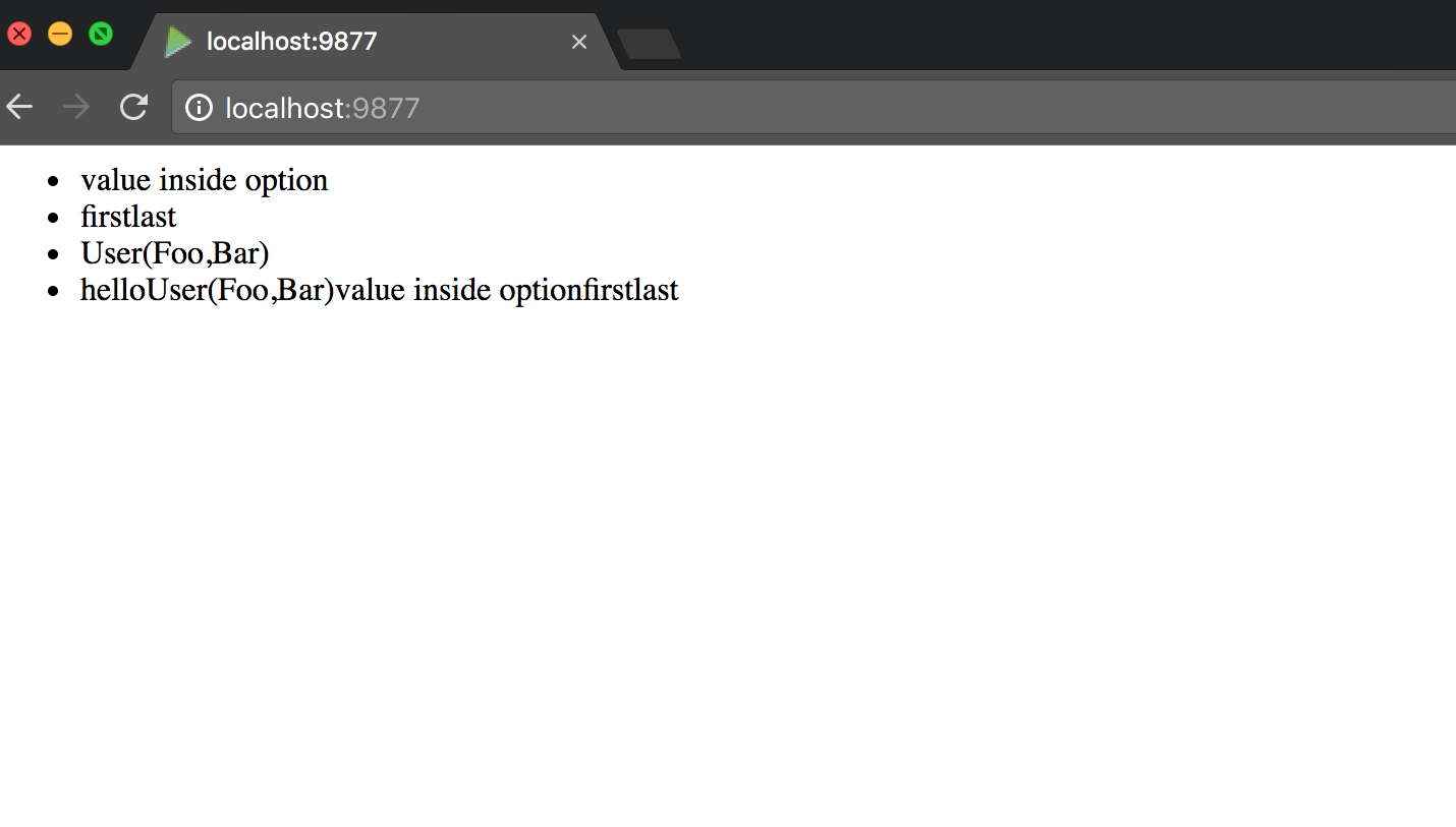 <li>@List("hello", User("Foo", "Bar"), Option("value inside option"), List("first", "last"))</li>